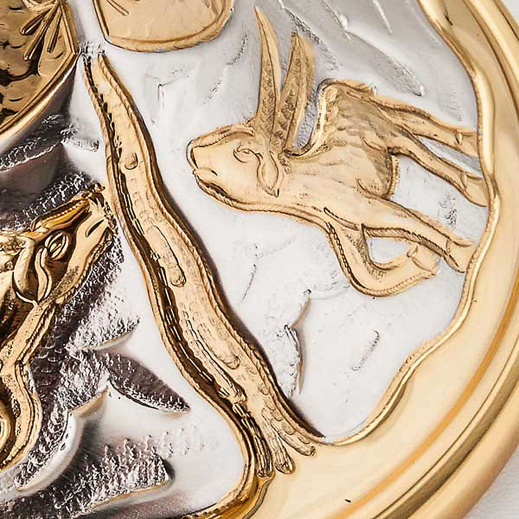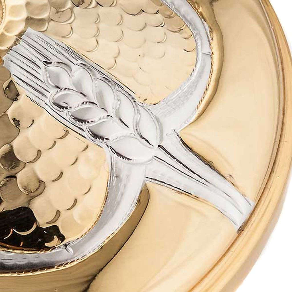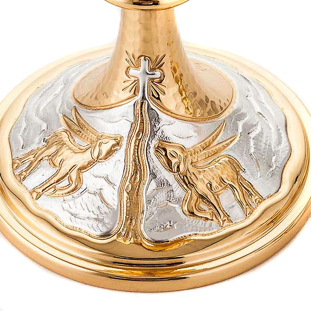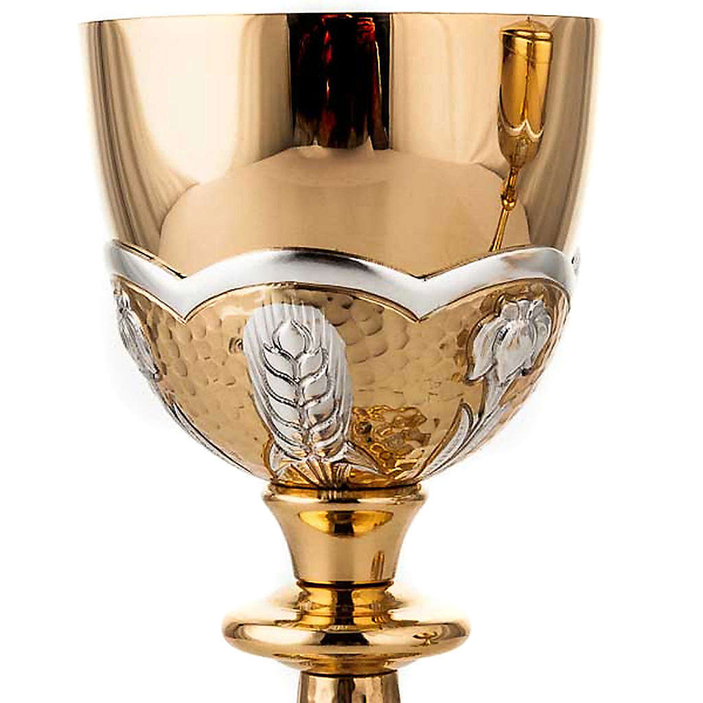 Cálice e cibório latão cinzelado cervos à fonte. Conjunto eucarístico composto por cálice e âmbula em latão cinzelado cor ouro e prata com imagem simbólica na base dos cervos que bebem à fonte. Ricas decorações de trigo na tampa do cibório.