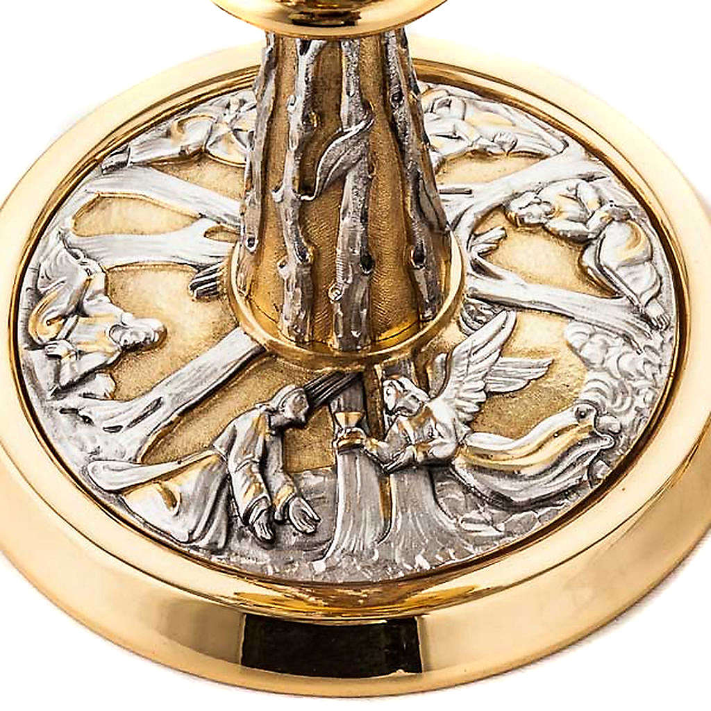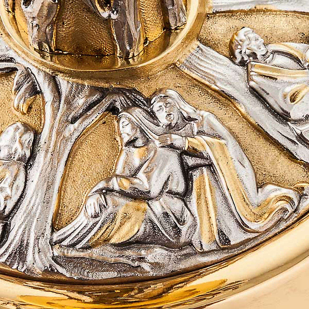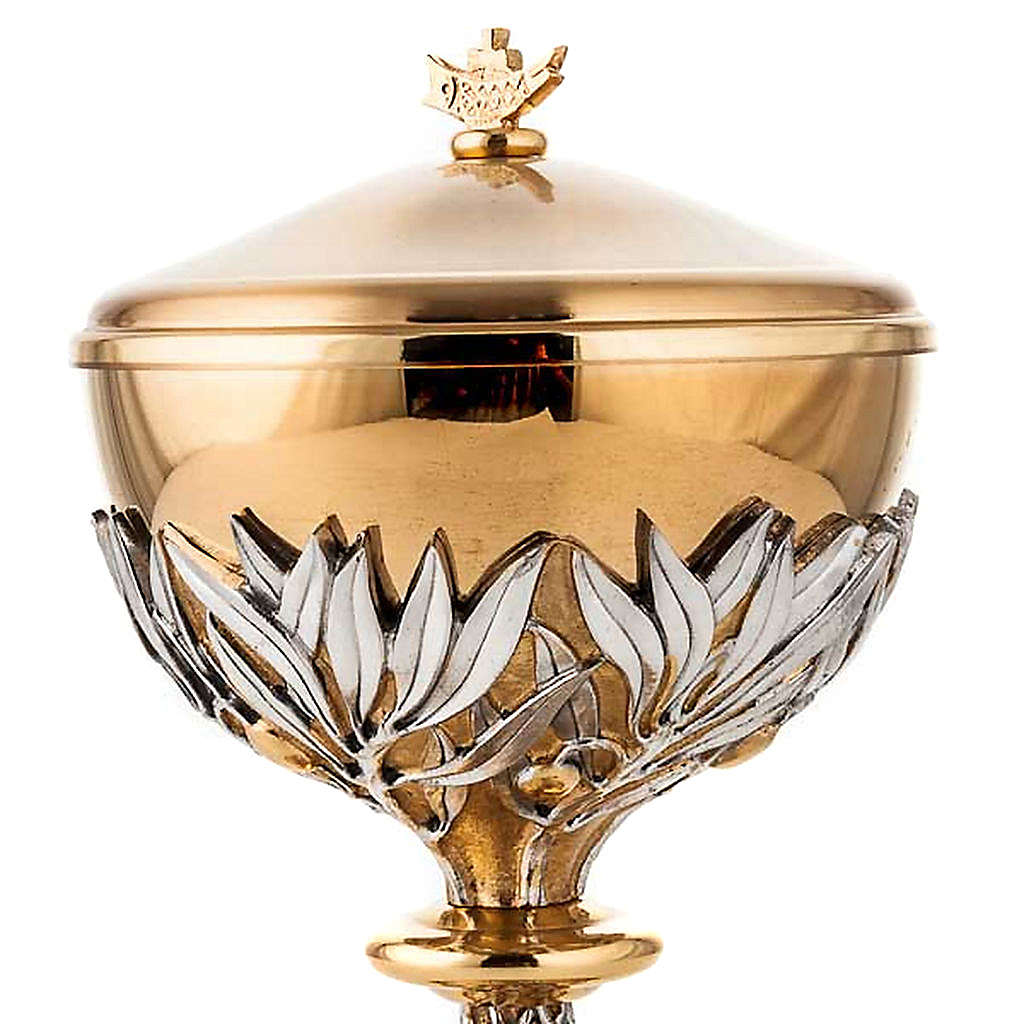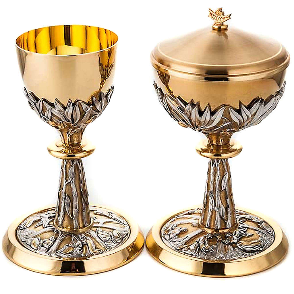 Cálice e cibório latão prensa de azeite (Getsémani). Cálice e âmbula realizados com processo de fundição a cera perdida em latão dourado e prateado, decorados na base com imagem do Getsémani. A tampa do cibório é lisa.