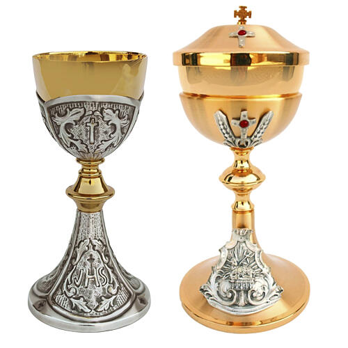 Conjunto litúrgico composto por cálice e píxide em estilo barroco, realizados em latão com acabamento em ouro acetinado 24K e decorados com elegantes riscas ornamentais cinzeladas, executadas manualmente com grande precisão.