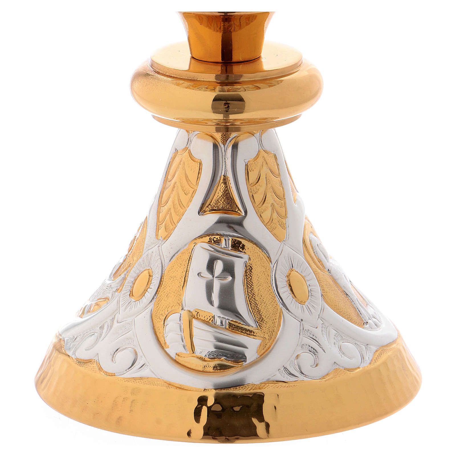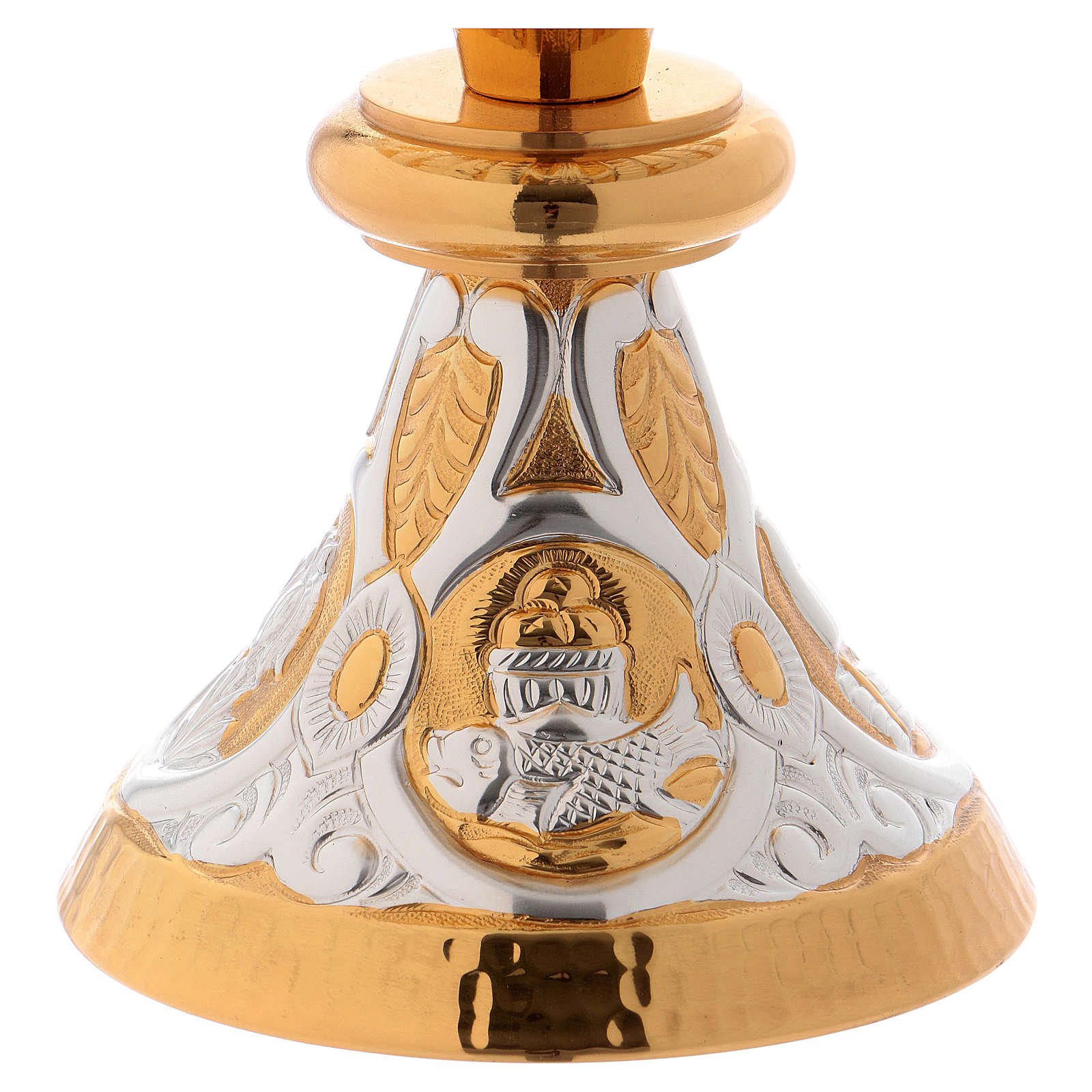 Na base do cálice e da píxide são representados os símbolos eucarísticos do Cordeiro e da Arca da Aliança. A tampa da âmbula também é decorada.