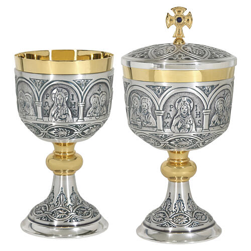 Cálice e píxide latão prateado cinzelado Tassilo Jesus e discípulos