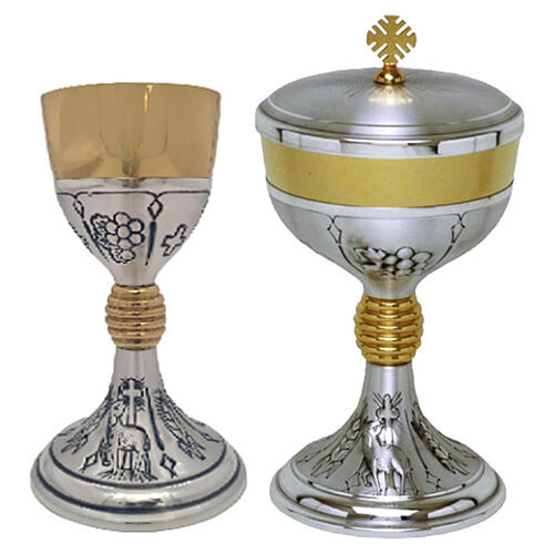 Conjunto de cálice e píxide em latão prateado, fabricado na Itália com acabamento cuidadoso.