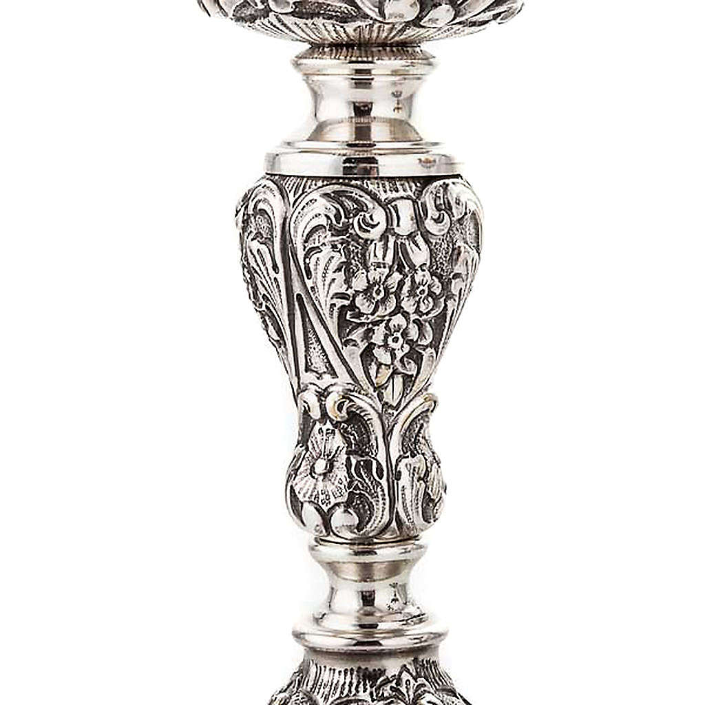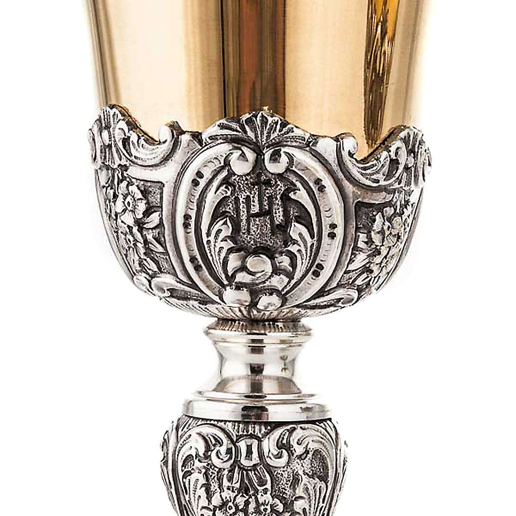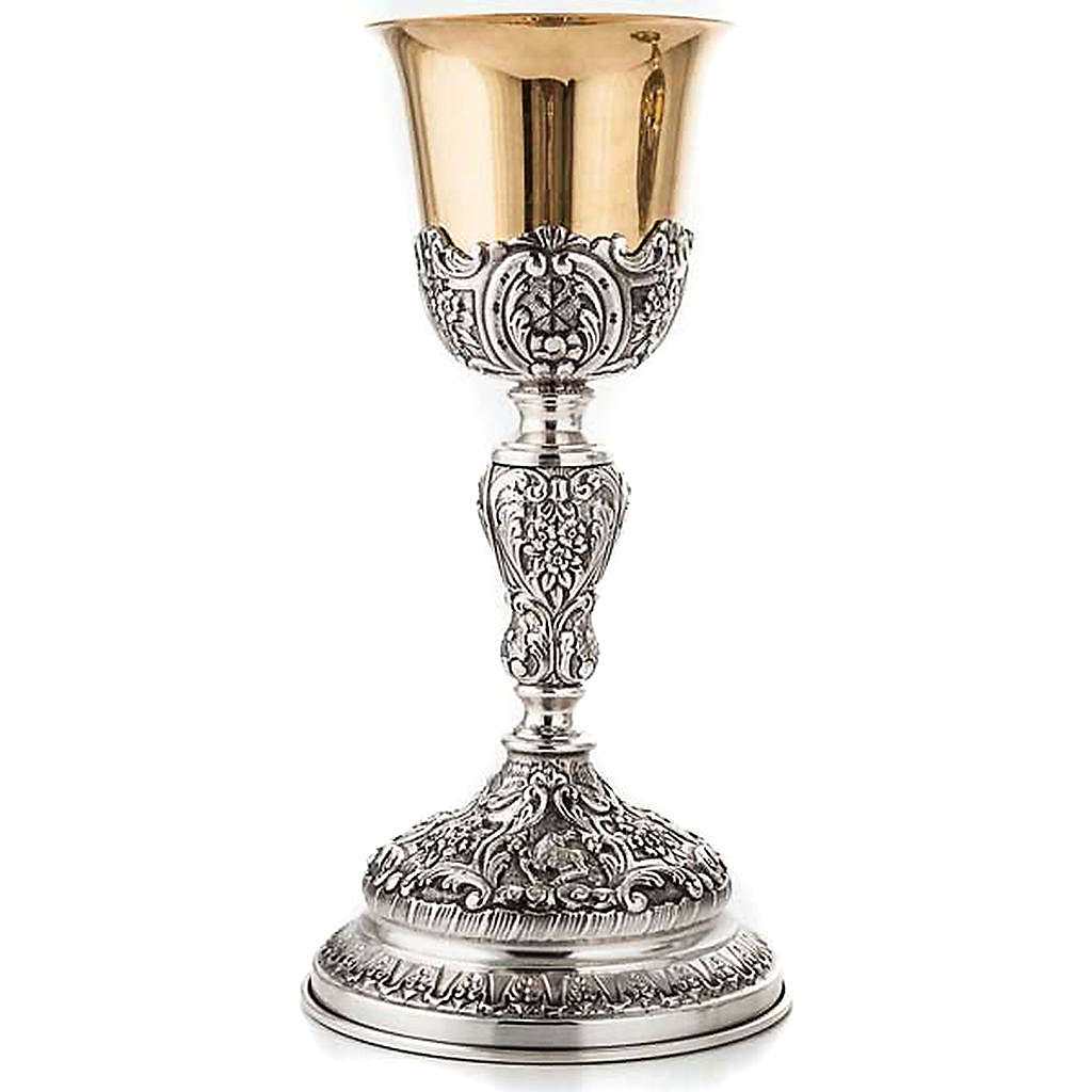 O cálice tem a copa em prata 800/1000 dourada e a base de planta em latão prateado cinzelado, finamente acabado.