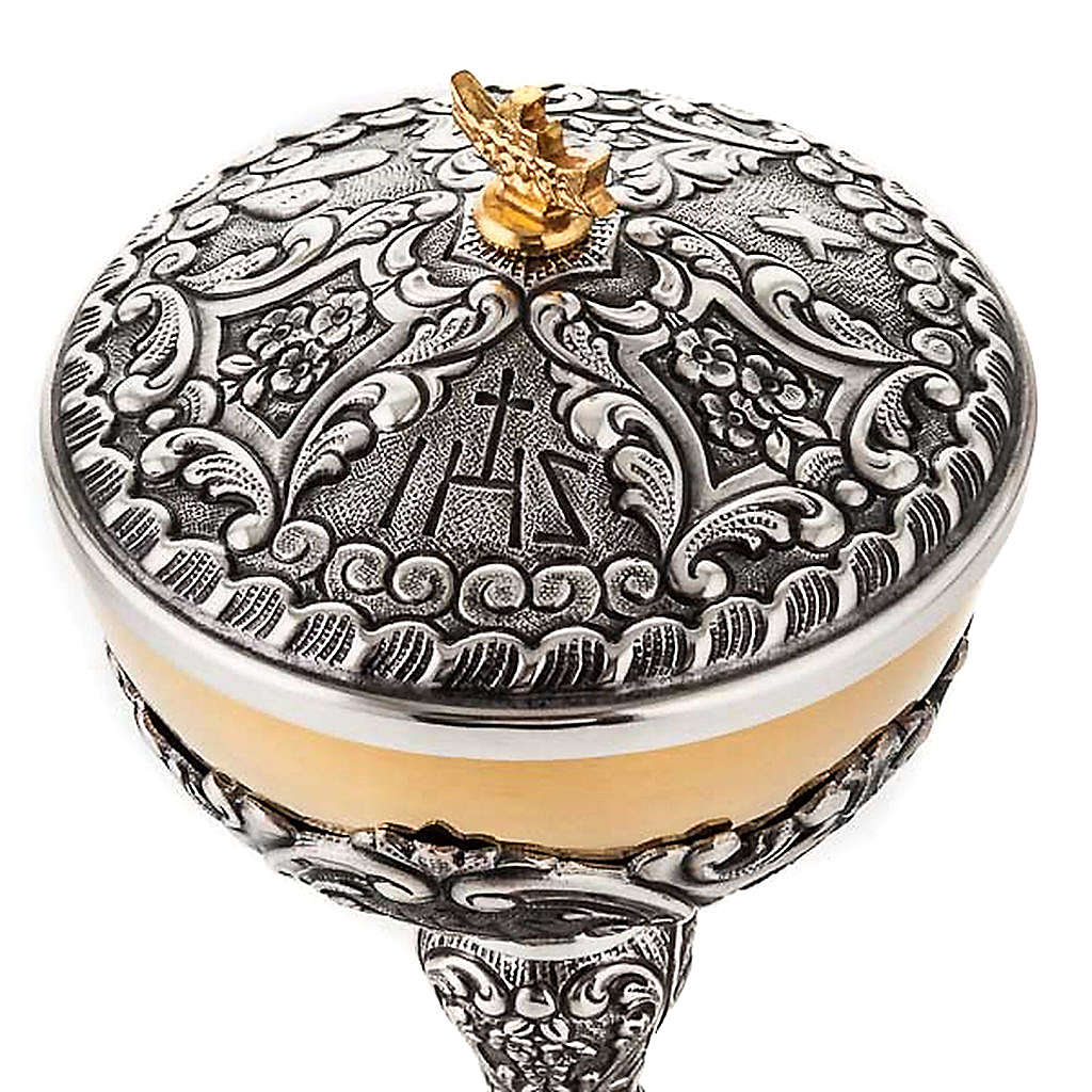 A píxide é realizada em latão bicolor cinzelado com uma base finamente acabada e decorada. A tampa da âmbula também é decorada.