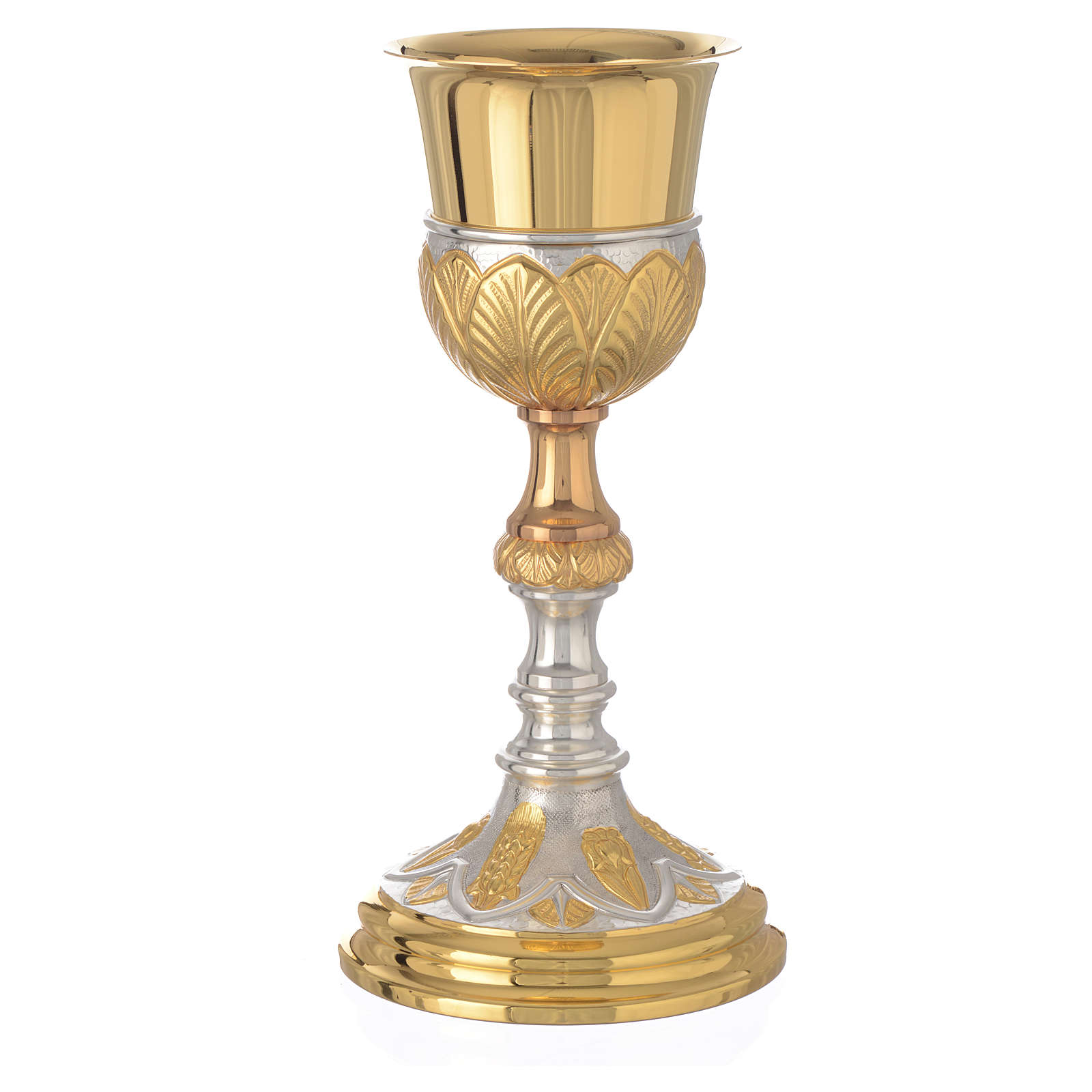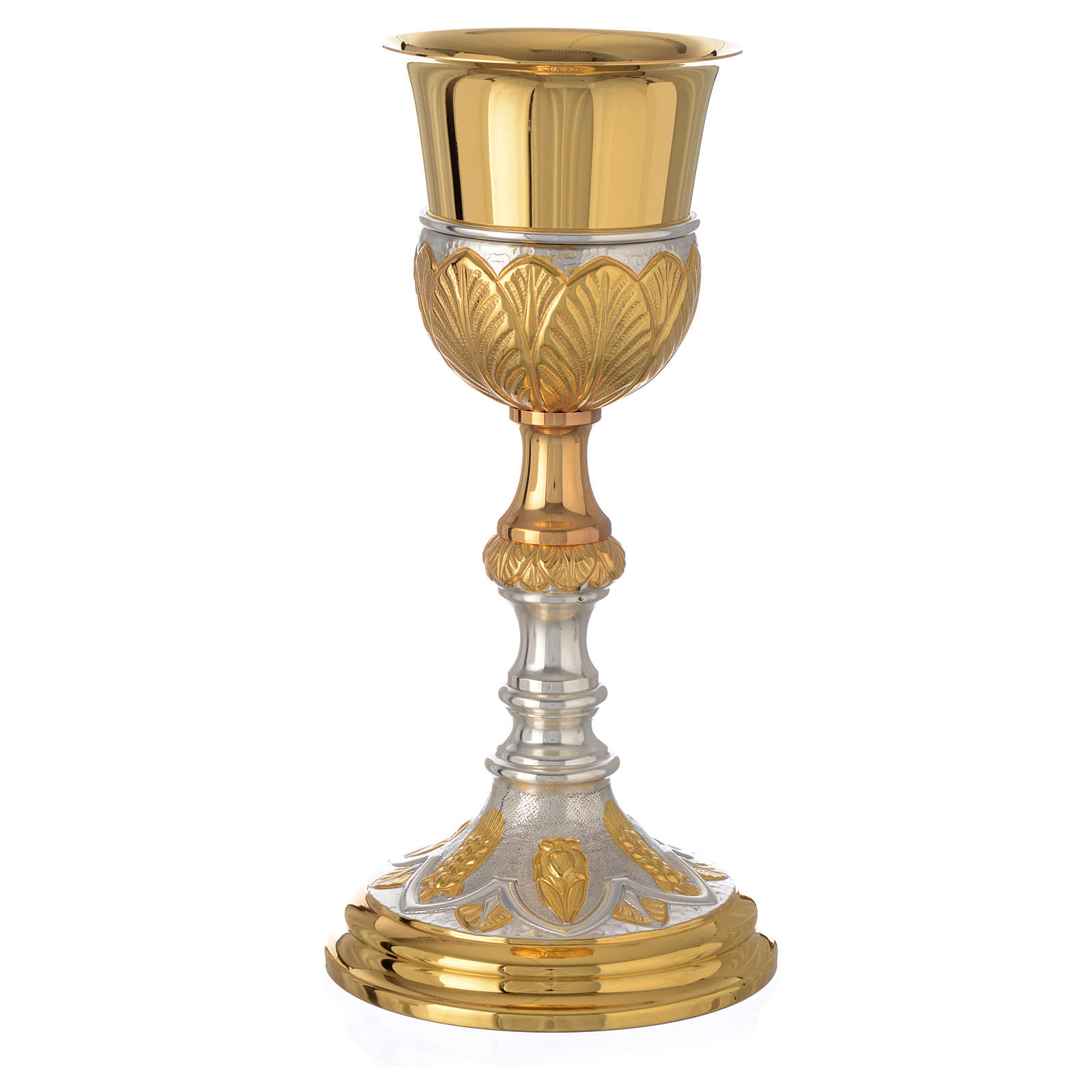 Cálice latão cinzelado pétalas. Cálice eucarístico em latão cinzelado bicolor com copa dourada, decorado com pétalas.