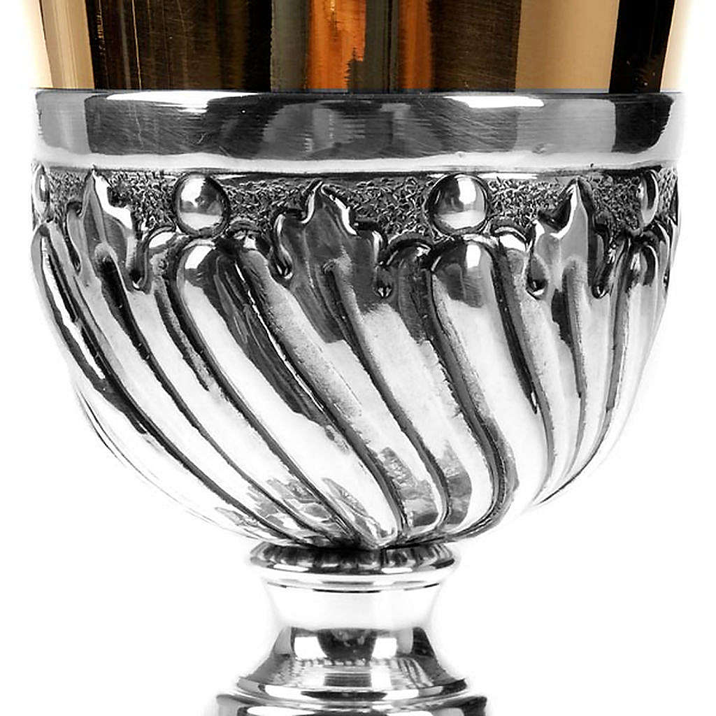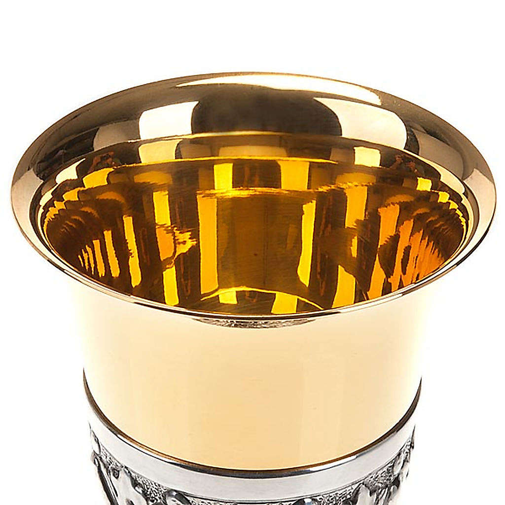 Cálice prata 800/1000 e latão decorado. Cálice eucarístico em latão prateado com copa em prata 800/1000 dourada. Os acabamentos decorativos tornam esta alfaia litúrgica numa peça única e original.