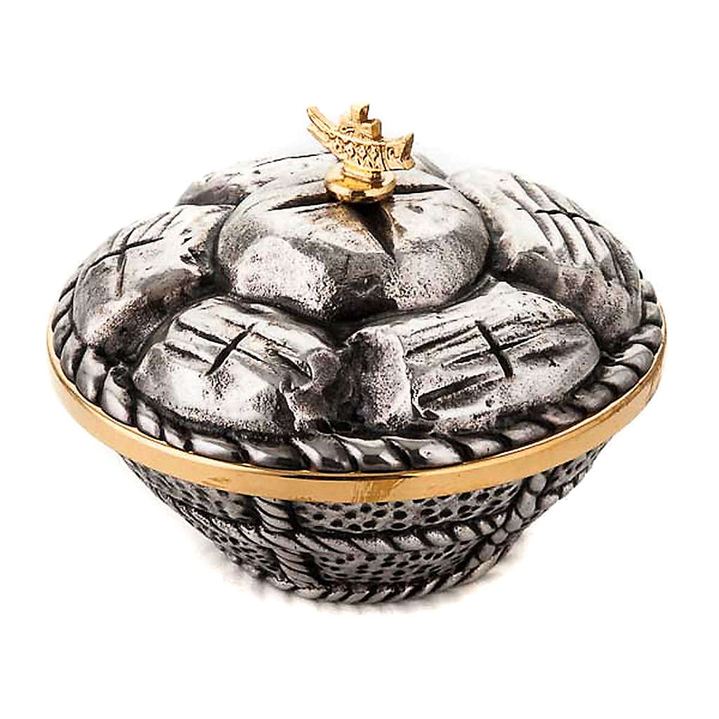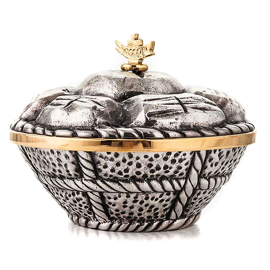 Cibório latão prateado cesto de pão. Cibório em latão prateado em forma de cesto com formas de pão na tampa.