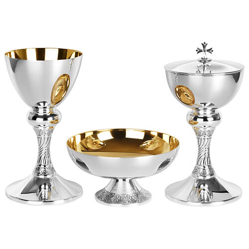 Conjunto para Comunhão Molina de latão padrão torcido. Conjunto litúrgico de píxide, cálice e patena para ofertório de latão dourado liso com efeito torcido no caule. Esto modelo da coleção Artimetal é manufacturado por Molina, empresa espanhola especializada na criação de acessórios litúrgicos de alta qualidade com metais preciosos.