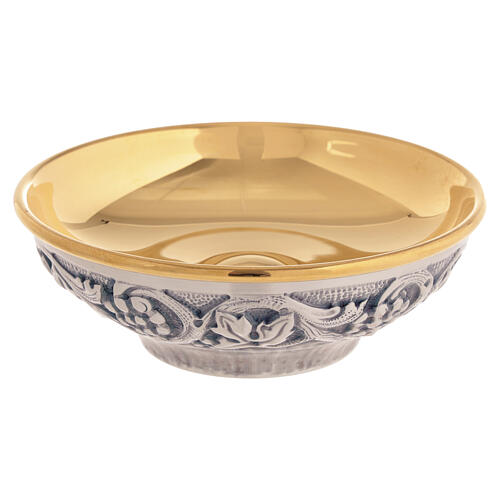 Pratinho litúrgico em metal com exterior prateado e interior dourado. O corpo apresenta uma faixa decorativa com galhos de videira e cachos de uva em baixo-relevo, resultado de cinzeladura manual, enquanto a superfície interna é lisa e refletora.