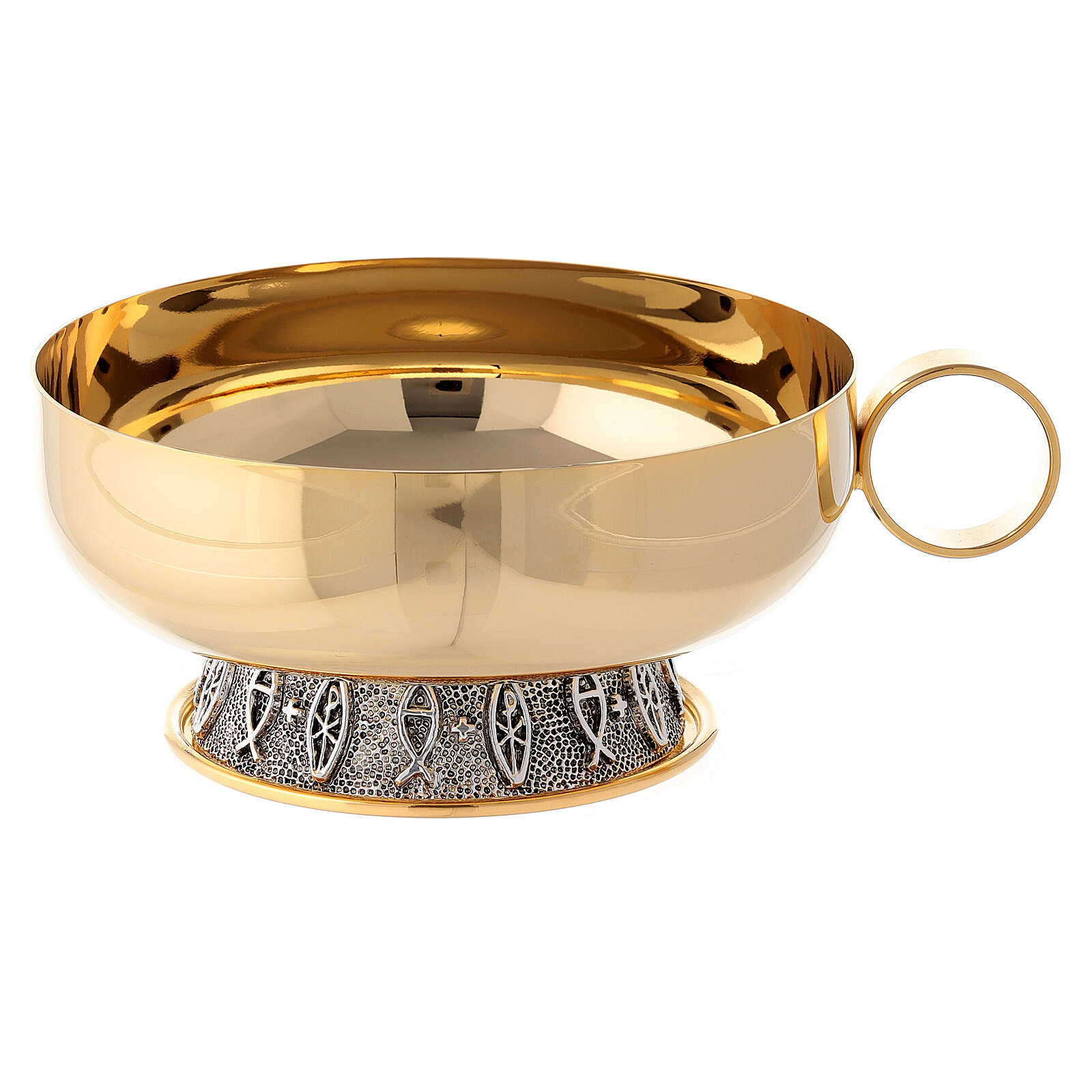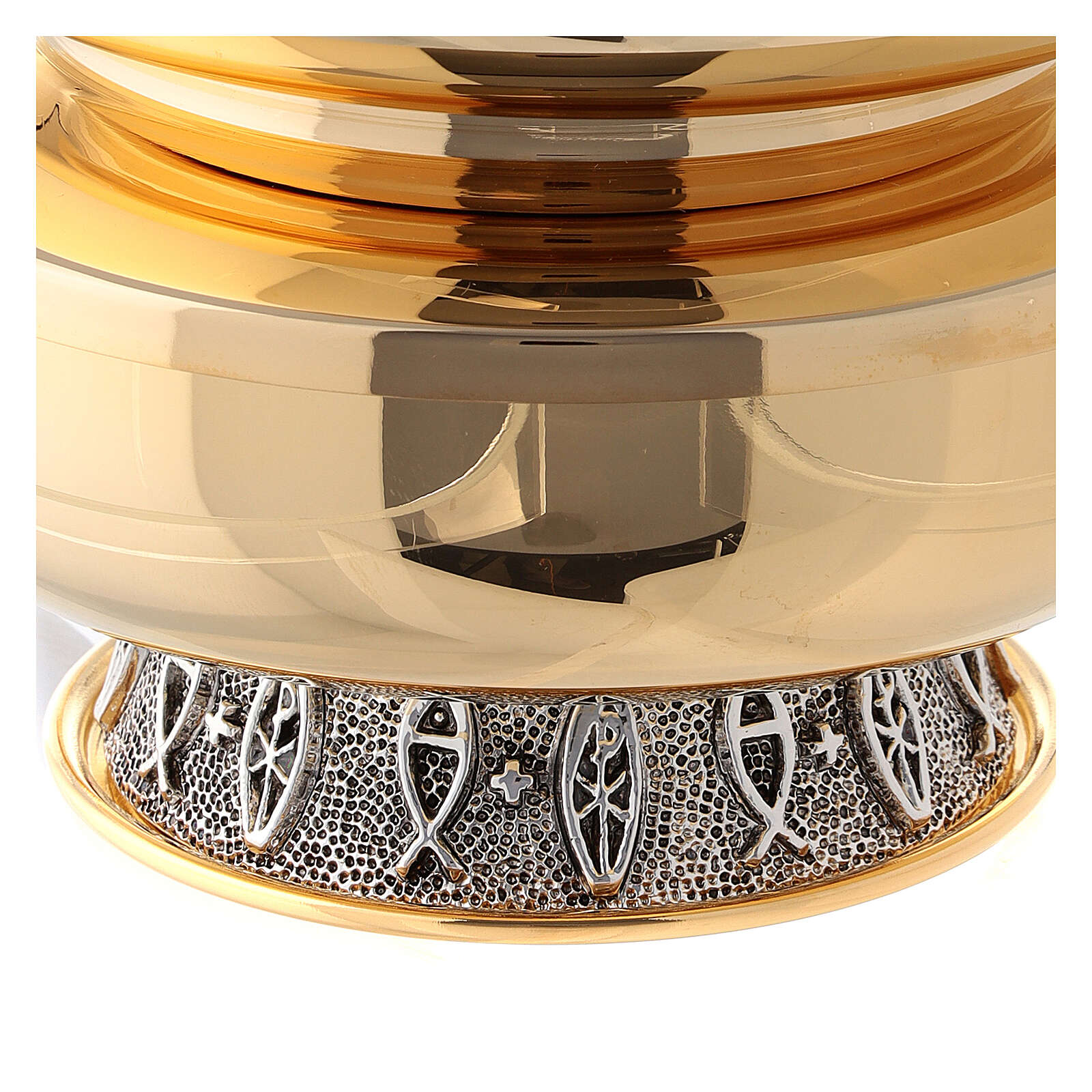 Píxide dupla latão brilhante diâmetro 14 cm. Píxide dupla realizada em latão dourado brilhante com tampa na píxide superior e decorações em latão prateado na base da segunda píxide. Modelo de forma circular de 14 cm de diâmetro.