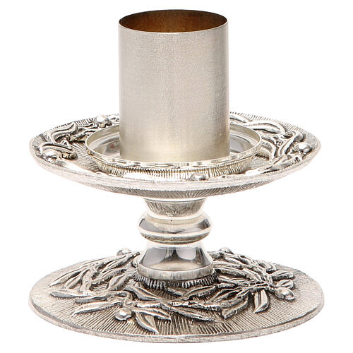 Castiçal de mesa bronze prateado ramos de oliveira. Castiçal de altar em bronze prateado com decorações de ramos de videira, realizado de forma artesanal numa empresa italiana com mais de 50 anos de experiência no sector litúrgico.