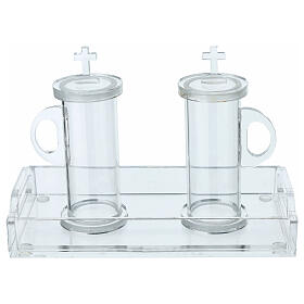 Galhetas de Vidro para a Celebração. As galhetas são os recipientes donde se colocam a água e o vino para a celebraçâo liturgica e podem ser de diferentes estilos, materiais e tamanhos. Nesta categoria do catálogo Holyart é possível encontrar galhetas de vidro com bandeja e tampas de metal, obras de empresas que realizam objetos litúrgicos de primeira qualidade há muitos anos. Há ampulas para a celebraçâo litúrgica de muitos estilos, simples ou elegantes, para todas as ocasiões.