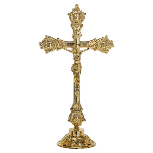 Fabricada em latão dourado na Itália, esta cruz de altar possui uma base em estilo barroco, igual à dos castiçais coordenáveis com o código PC002166, permitindo compor um conjunto harmonioso no altar.