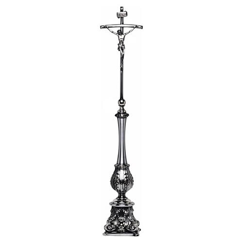 Cruz de altar prateada com base barroca e decoração de folhas de acanto 65 cm.