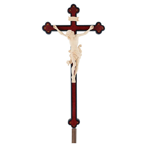 Cruz Leonardo processional madeira natural cruz barroca antiga. Cruz processional barroca antiquada com Corpo de Cristo Leonardo em madeira natural.