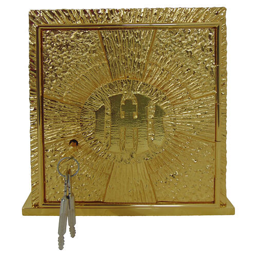 Sacrário de mesa em latão dourado fundido com símbolo IHS e raios 25x21x25 cm