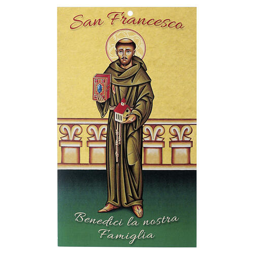 No verso encontra-se o texto da bênção da família em italiano, uma oração pensada para ser rezada em conjunto, pedindo proteção e serenidade para a casa e seus moradores.