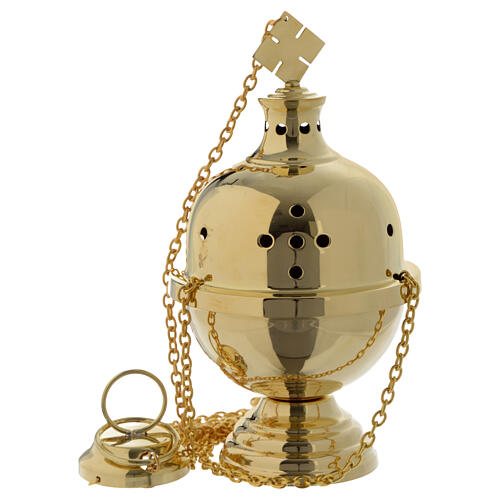 Turíbulo realizado em latão dourado polido, resistente e adequado para uso litúrgico. A corrente está ligada a uma cruz de forma moderna e estilizada, tornando o turíbulo prático de manusear. Nas laterais existem as aberturas tradicionais que permitem à fumaça do incenso sair corretamente mesmo quando o turíbulo permanece parado.
