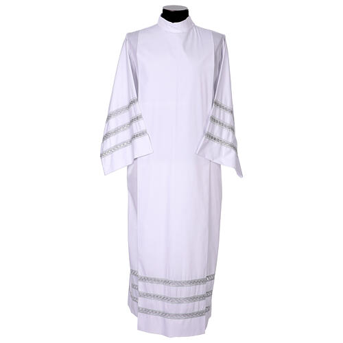 Alva três linhas bainha aberta cinza clara. Esta alva branca em misto de algodão é adornada com três voltas de bainha aberta em cinza claro. O bordado está presente tanto na parte inferior da alva quanto nas mangas, adequando-se a cada celebração litúrgica, proporcionando um ajuste confortável. Disponível em diferentes tamanhos.