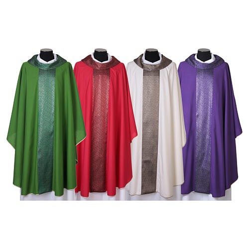 A casula, acompanhada pela estola coordenada, está disponível nas quatro cores litúrgicas: marfim, vermelho, violeta e verde.