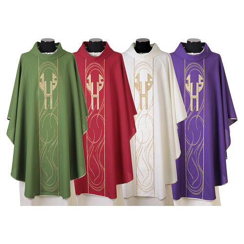 Casula com faixa central e letras IHS douradas.