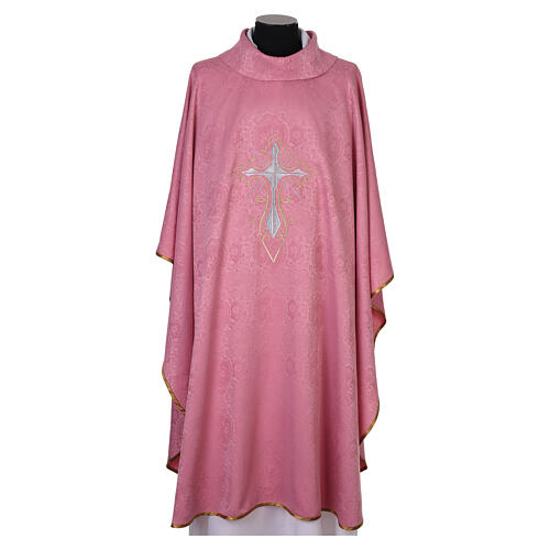 Casula cor-de-rosa adamascada com bordado de cruz dourada e prateada.