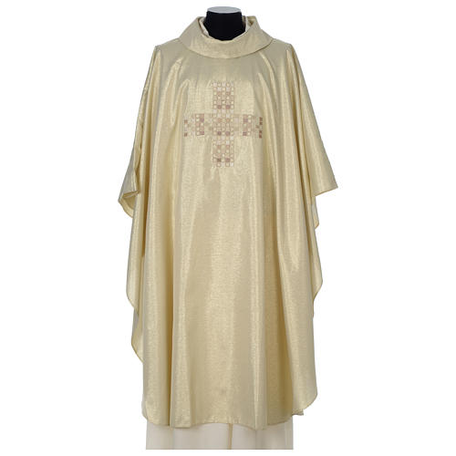Elegante casula sacerdotal dourada realizada em poliéster por uma empresa italiana especializada na criação de paramentos litúrgicos de alta qualidade. A casula é decorada por uma cruz central estilo mosaico.