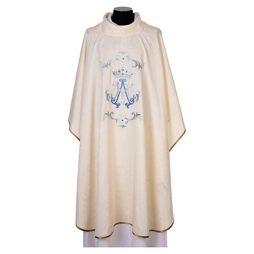 O caimento é assegurado pelo corte amplo, complementado por uma gola em anel sóbria. A decoração central apresenta um elaborado bordado com o Monograma Mariano em fio azul e prata, encimado por uma coroa.