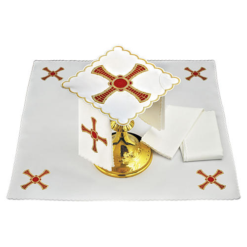 Conjunto alfaias linho cruz vermelha ouro com trigo. Conjunto para altar confeccionado em linho, bordado com uma cruz dourada e vermelha, decorada com 2 riscas douradas também. Conjunto composto por 4 peças: