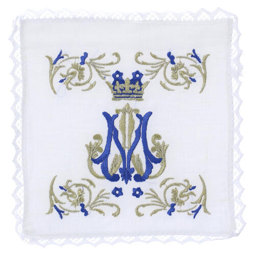 Conjunto de altar Mariano com bordado em ouro e azul, confeccionado em puro linho.