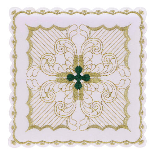 A pala é decorada com uma cruz bordada em verde e ouro, juntamente com motivos abstratos, e possui um cartão removível para manter a rigidez.