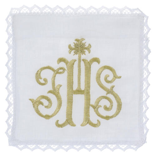 Este conjunto para missa, composto por corporal, purificatório, pala para cálice e manustérgio, é confeccionado em linho 100% puro. O elemento distintivo é o monograma JHS, bordado com elegância e precisão em fio dourado. O monograma está enquadrado por motivos em forma de raios e volutas douradas, conferindo ao conjunto sobriedade e solenidade.