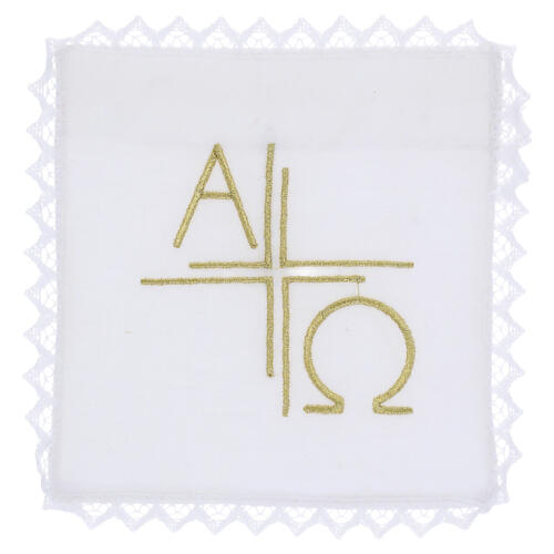 O conjunto inclui corporal, purificatório, pala para cálice e manustérgio.