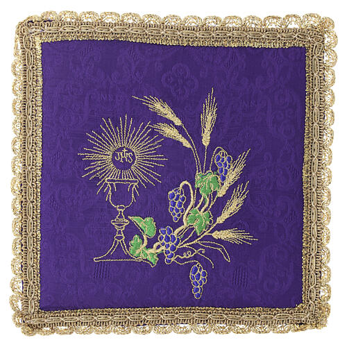 Pala para cálice cetim roxo com cálice e uva. Pala em cetim roxo, bordada com desenho de cálice e uva.