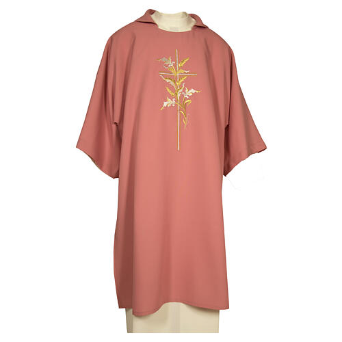 Dalmática bordada poliéster trigo cruz roxa. Dalmática roxa inteiramente confeccionada na Itália numa oficina de artesanato com anos de experiência e enriquecida por um bordade de cruz com trigo.