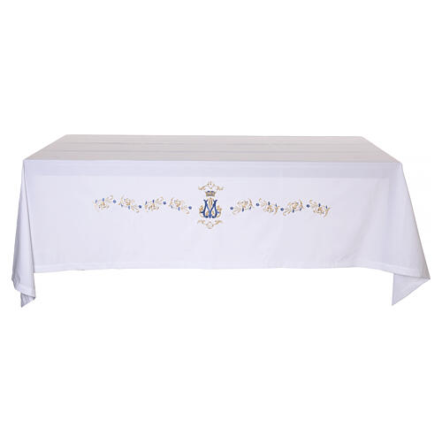 Toalha de altar com decoração mariana bordada.