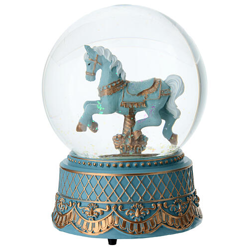 Globo de vidro com carrossel de cavalo azul de 16 cm.