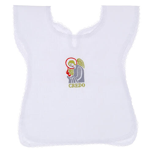 Túnica para Batismo com bordado de um anjo segurando uma chama, símbolo de luz e pureza. Sob a imagem, a palavra CREDO está bordada, expressão de fé e esperança.
