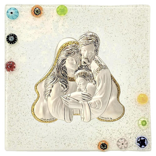 Quadrinho religioso com representação da Sagrada Família em bilaminado de prata, aplicado sobre vidro decorado com murrine de Murano.