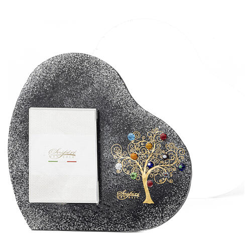 Porta-retrato artesanal em vidro preto, decorado com a Árvore da Vida em ouro maciço e murrinas venezianas em vidro de Murano.