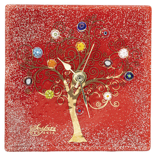 Relógio de mesa quadrado com murrinas em vidro de Murano vermelho, decorado com Árvore da Vida em ouro maciço.