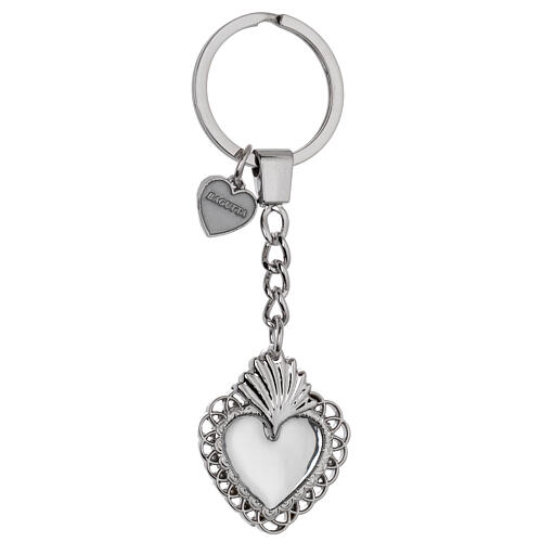 Chaveiro coração votivo prateado. Chaveiro com pingente em forma de coração votivo prateado, medindo 4 cm de altura e 3 cm de largura, acompanhado por uma pequena bolsa branca em couro sintético com um pequeno lenço nos cabos. O chaveiro é equipado com um anel de metal com 3 cm de circunferência. Esta criação é realizada pela marca italiana Bagutta, uma empresa dinâmica fundada em 2000 em Bérgamo, especializada em presentes, lembranças, acessórios para casa e papelaria. Com presença con...