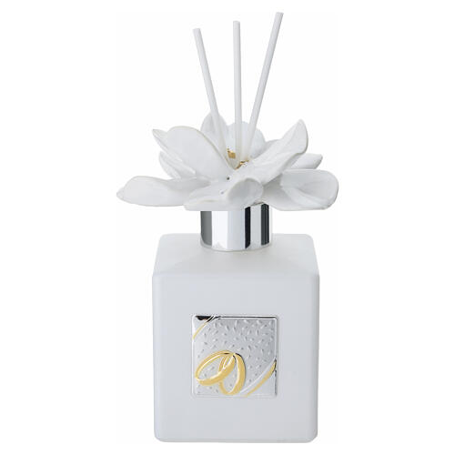 Perfumador de ambiente de 200 ml com decoração de flor e alianças entrelaçadas.