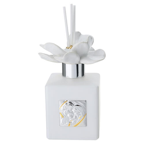 Aromatizador de ambiente de 200 ml pensado como lembrancinha, com plaquinha decorativa bilaminada que representa a Sagrada Família.