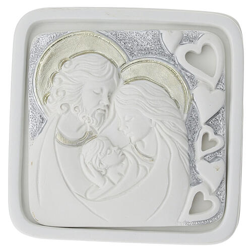 Caixinha em resina decorativa com representação da Sagrada Família em alto-relevo, indicada para guardar pequenos objetos e como lembrança em ocasiões religiosas.