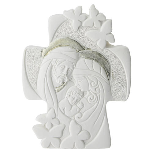 Lembrancinha de apoio em forma de cruz com representação da Sagrada Família em resina.