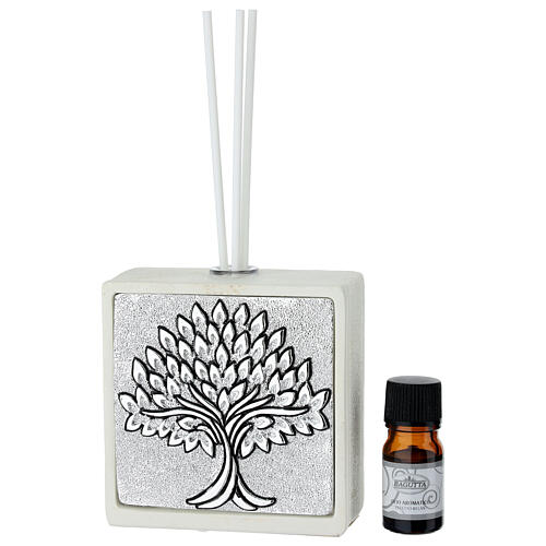Lembrancinha difusor árvore da vida óleos essenciais de frutas cítricas 9x9 cm Bagutta. Perfumador de ambiente quadrado com elegante decoração em prata representando a Árvore da Vida, medindo 9x9 cm e tem 4 cm de espessura.