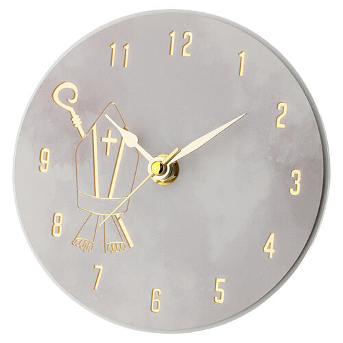 Lembrancinha para Crisma em forma de relógio redondo decorado com mitra e báculo.