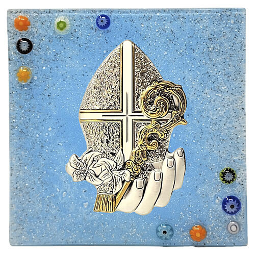 Quadrinho Crisma em vidro de Murano azul com báculo e mitra