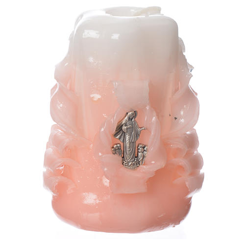 Vela Medjugorje cor-de-rosa 8x4,5 cm. Vela de Medjugorje realizada em cera cor-de-rosa com aplicação em metal de imagem da Virgem.